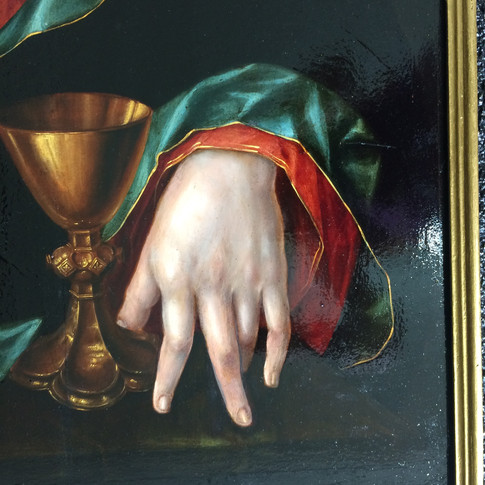 Lors de ces retraits, nous avons pu constater l'aspect et la position des mains originelles peintes par l'artiste: une torsion étrange des doigts de la main gauche écartés et posés sur la table tandis que la main droite arborait un majeur particulièrement long. Ces étrangetés qui font toute la saveur du tableau avaient sans doute été jugées trop excentriques par un précédent "restaurateur". En rognant le majeur trop long et en modifiant sciemment la position tendue des doigts par un fléchissement il avait choisi d'atténuer les bizarreries de cette œuvre. Ce qui nous a semblé plus curieux en revanche, c'est ce repeint venant recouvrir d'un glacis sombre la couleur verte richement chatoyante du revers du manteau entourant le Christ. Toutes ces modifications, si elle visait surement à "assagir" ou normaliser la représentation, lui avait finalement fait perdre une partie de sa valeur.