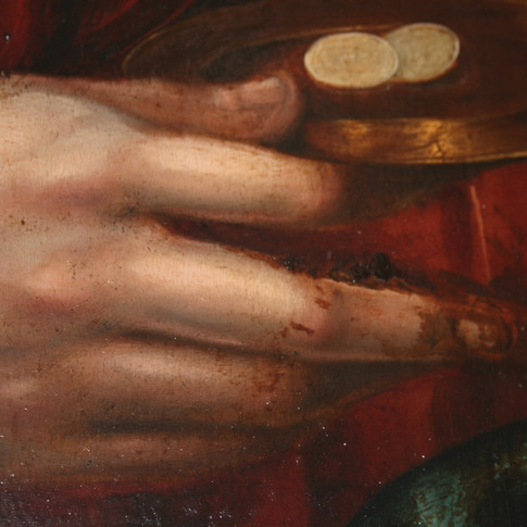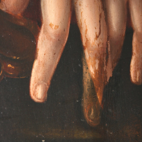 C'est en observant avec attention les doigts du Christ que nous nous doutions cependant que le tableau nous réserverait des surprises. Lors du constat, nous avions aperçu par transparence un doigt dont la position semblait différente. A ce stade, la question était encore de savoir s'il s'agissait d'un repentir, une modification effectué par le peintre lui même lors de la création, ou si cela pouvait être une modification postérieure, ce que nous appelons un "repeint".